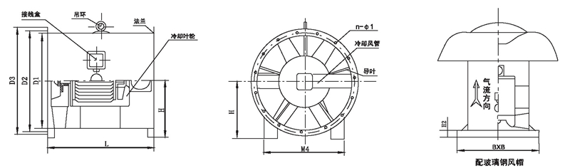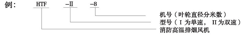 注: HTF型可根据需要制成消音型(进出风端加置专用消声器) ;表示方法: 机号后面加字母“X”。HTF型均可制成屋顶式,表示方法:机号后面加字母“W”