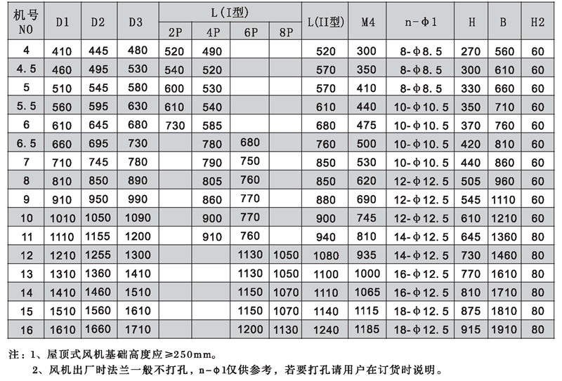 四、HTF型风机外形尺寸表(单位: mm)