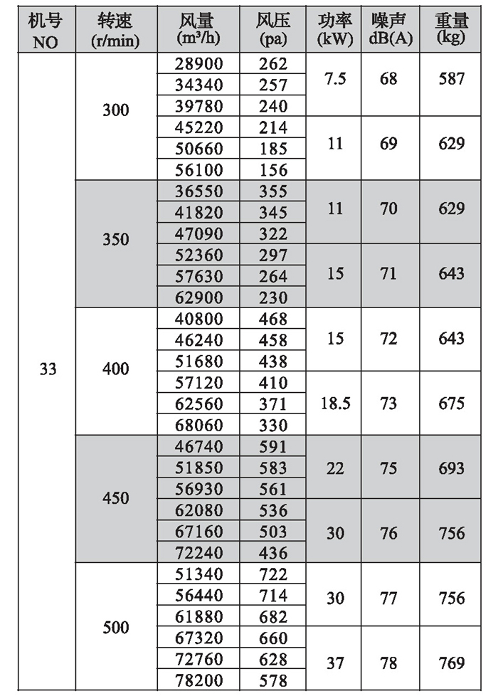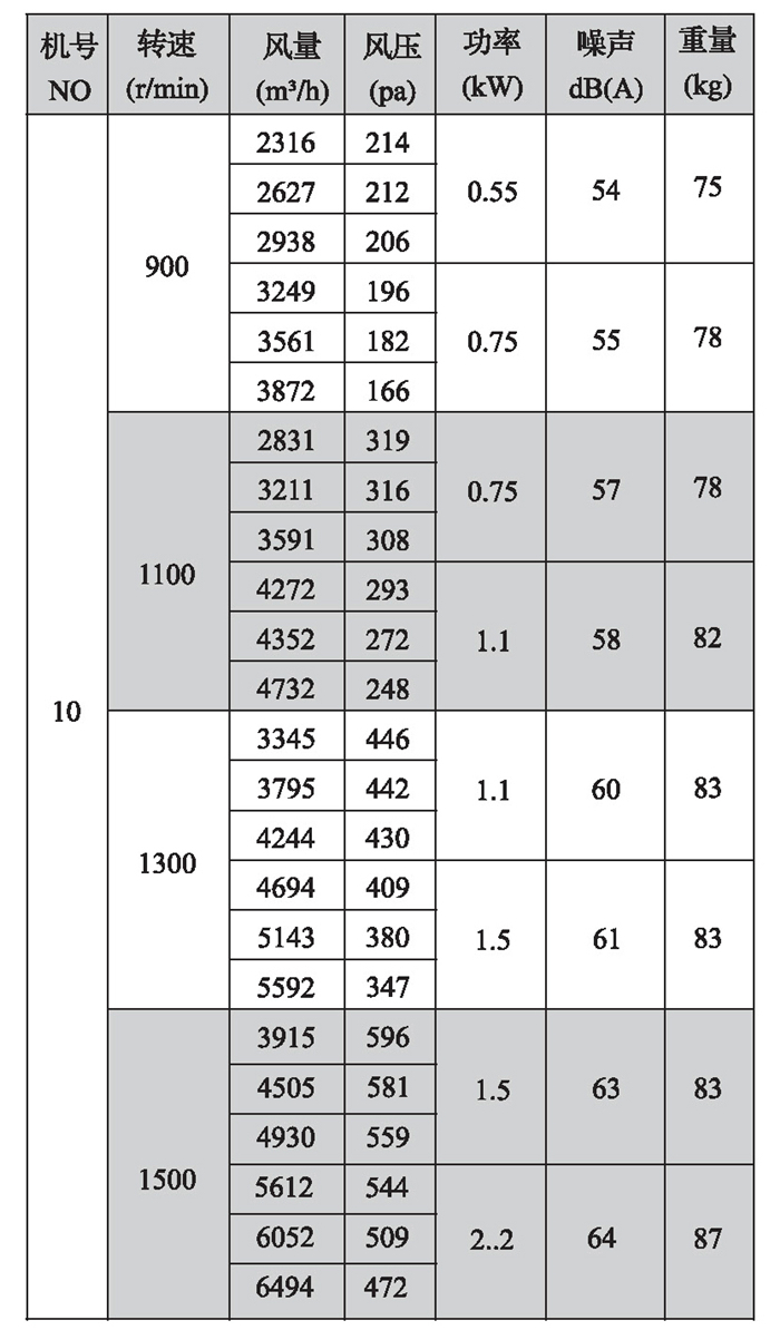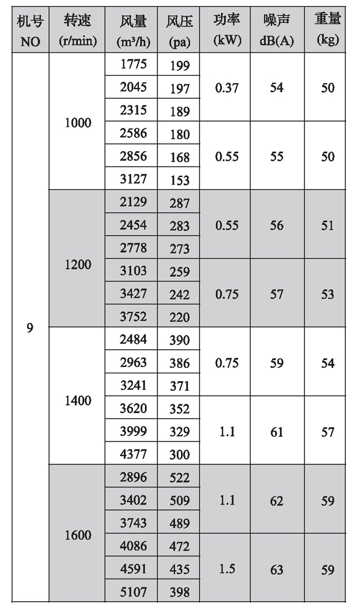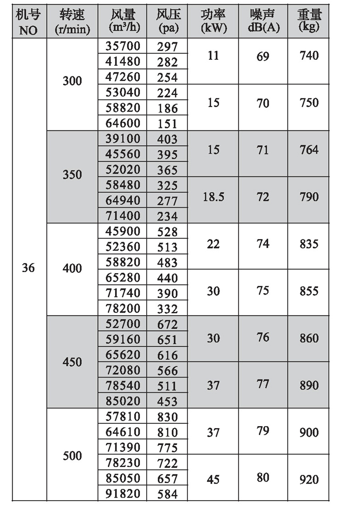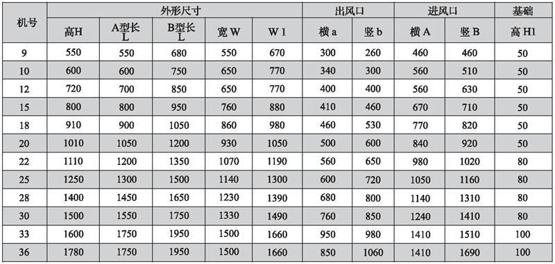 2.机号NO为叶轮直径英寸数,如电机放在风机上面,A型高度须补加电机高度,宽度须补加皮带罩宽度;如电机放在风机侧面,A型宽度须补加电机长度。