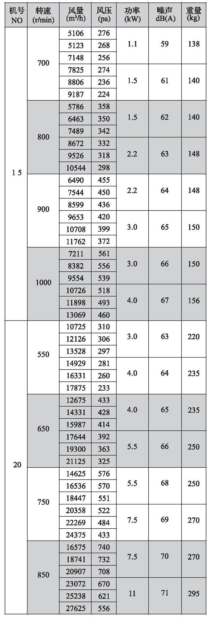 三、性能参数表