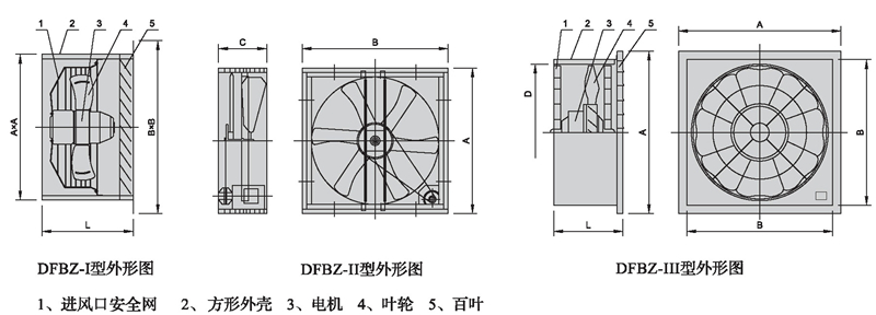 DFBZ-I型为采用内转子电机直联传动结构形式、DFBZ-Ⅱ型采用内转子电机、皮带传动结构形式,DFB-Ⅲ型为采用外转子电机直联传动结构形式。可根据用户要求制威防腐防爆型。